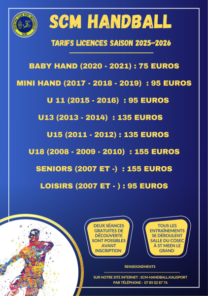 Le SCM Handball vous donne rendez-vous à la reprise pour une nouvelle saison riche en émotions ! Vous pouvez déjà créer ou renouveler votre licence alors n'hésitez pas à consulter les infos de la saison 2025-2026 (tarif licence, horaires entraînements..) en cliquant ci-dessous.